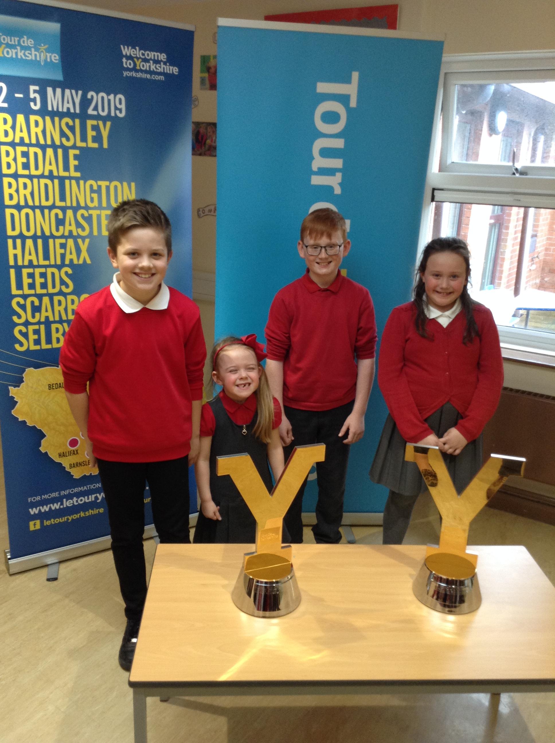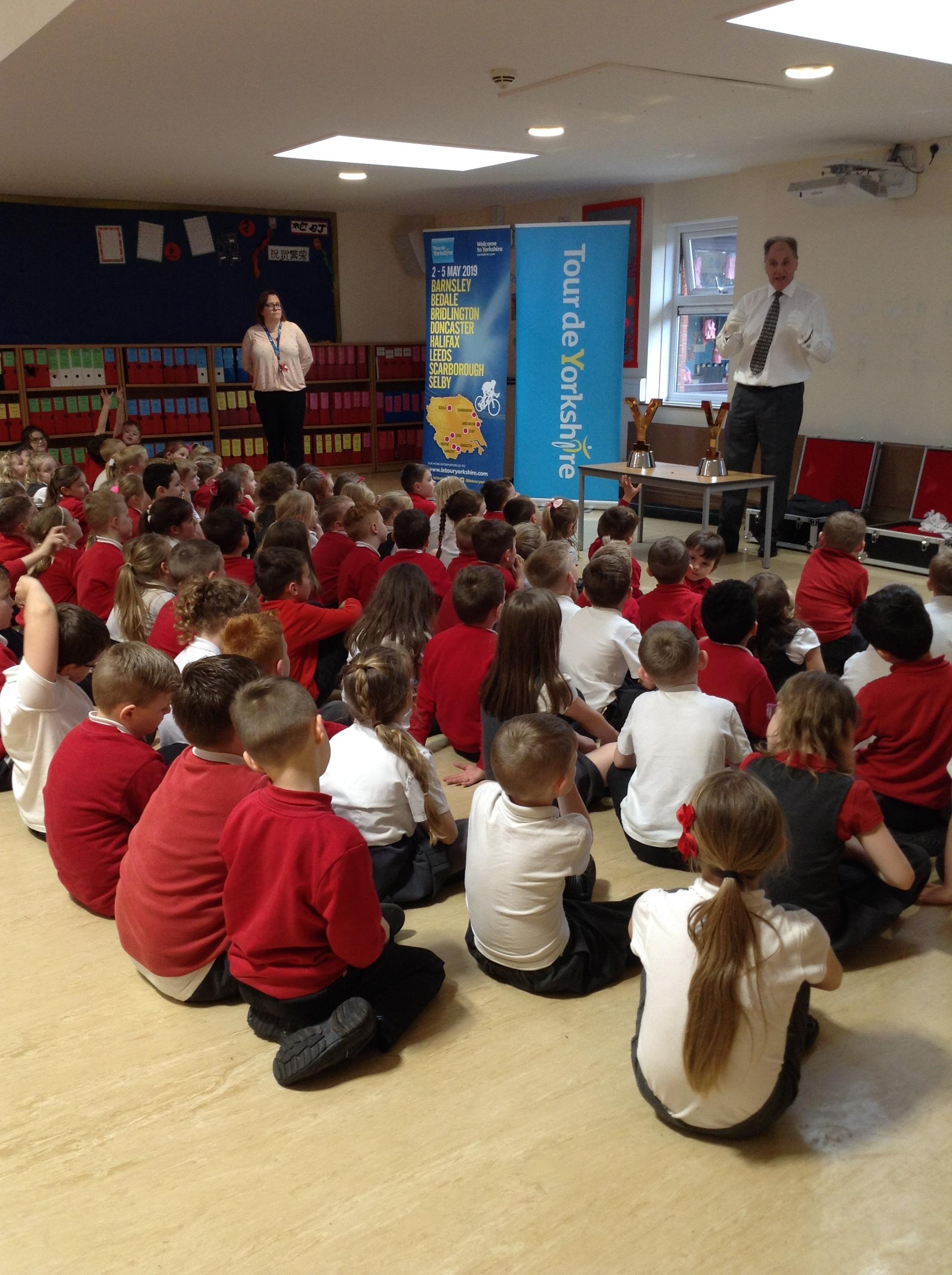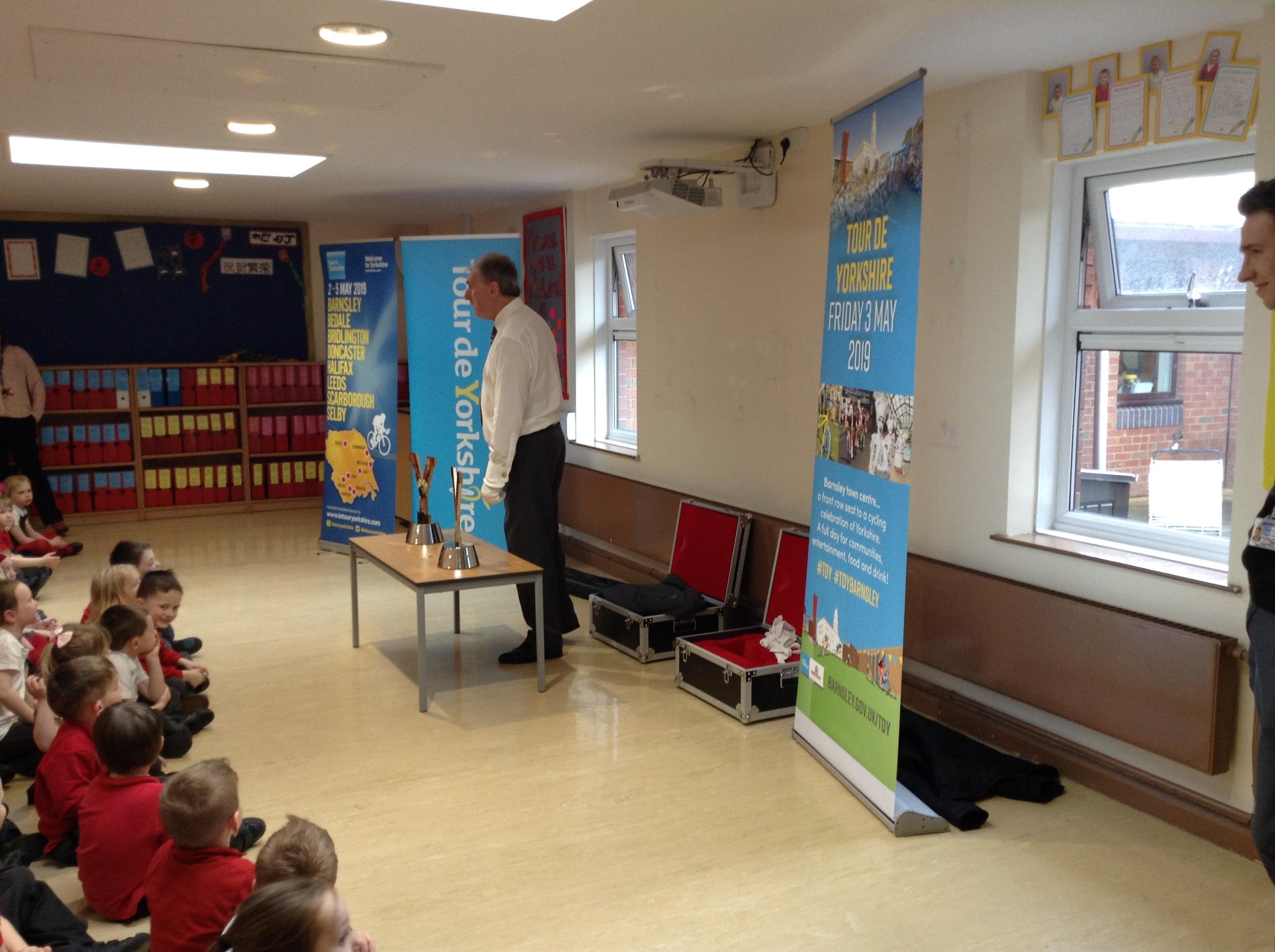 This week we were visited by the good people from the office of Tour de Yorkshire. We are super excited that the race will be running right past our school gate!!!! So…. a nice gentleman came in to tell us all about the different races and what it would mean for our school. We even got to look at the trophies that the winner get their names engraved onto (Miss Wroe and Mrs Tabbner even got to hold them and they were very heavy. They had to wear special gloves to protect the trophy).