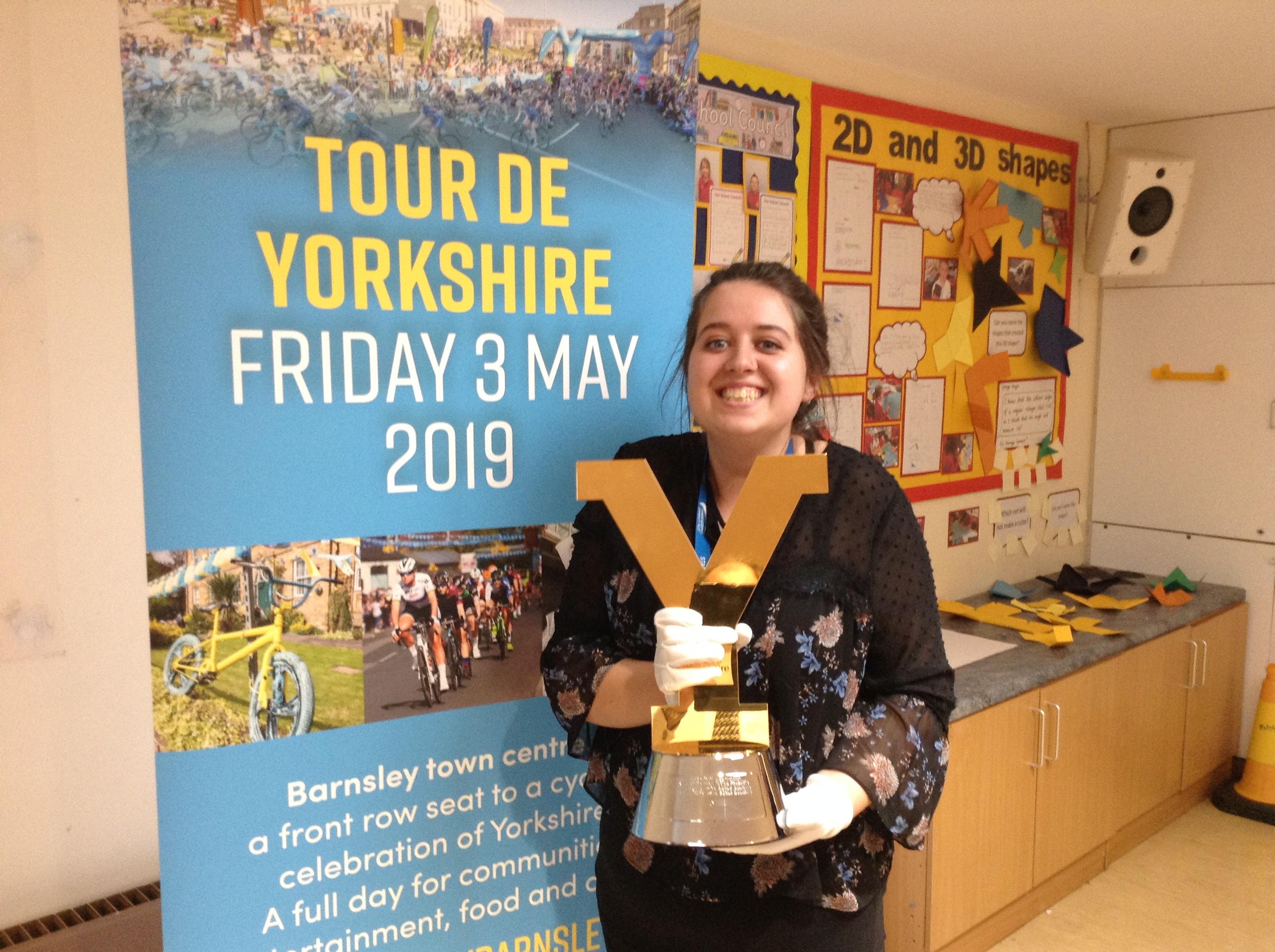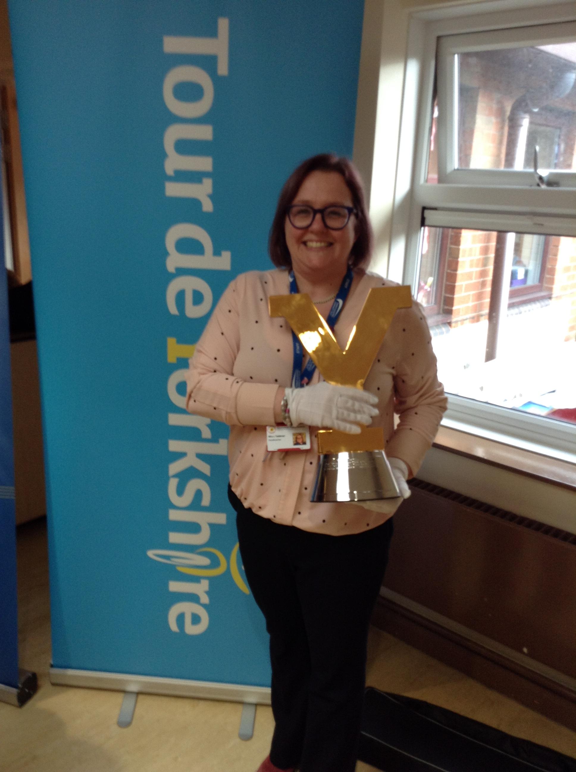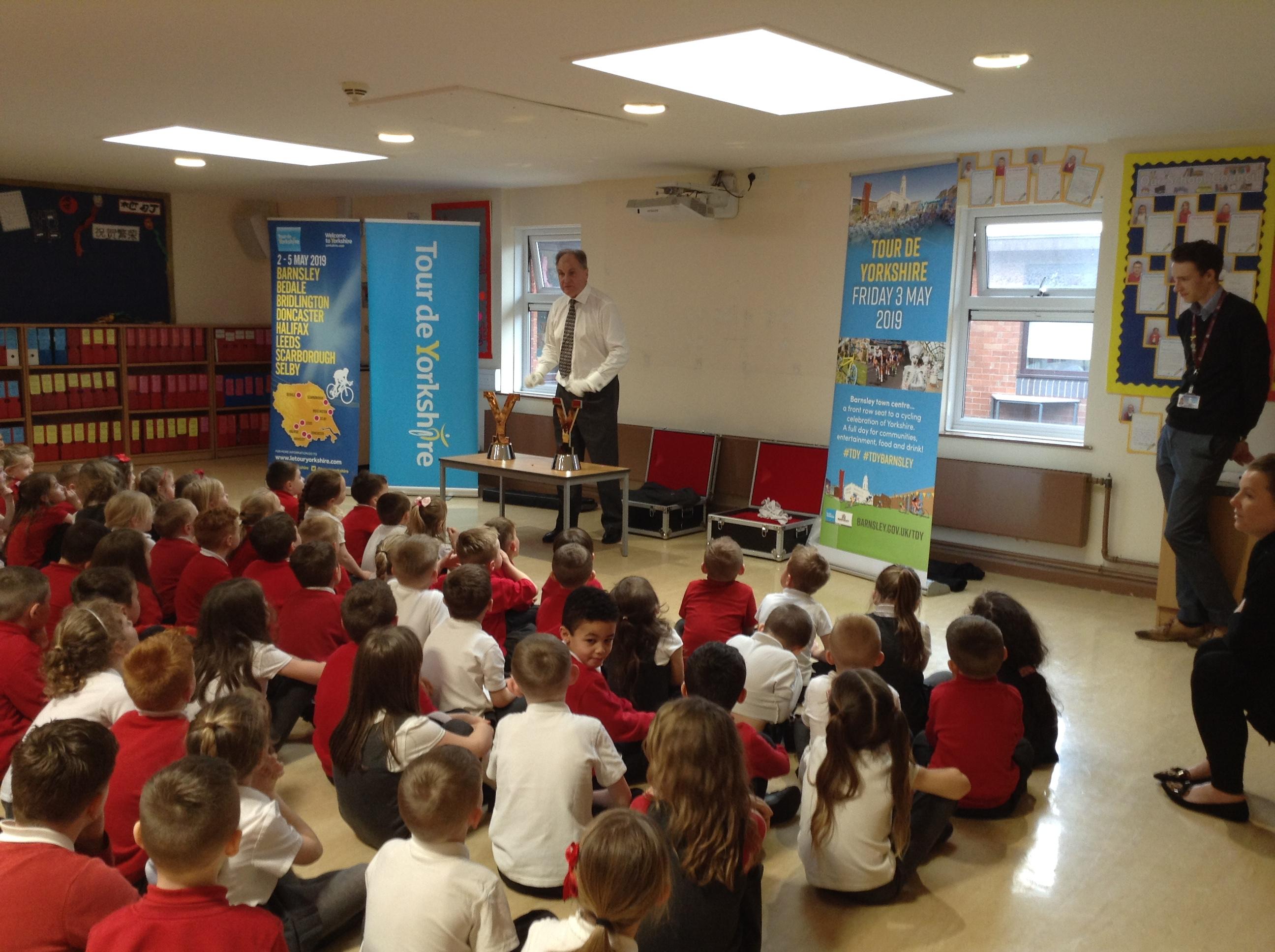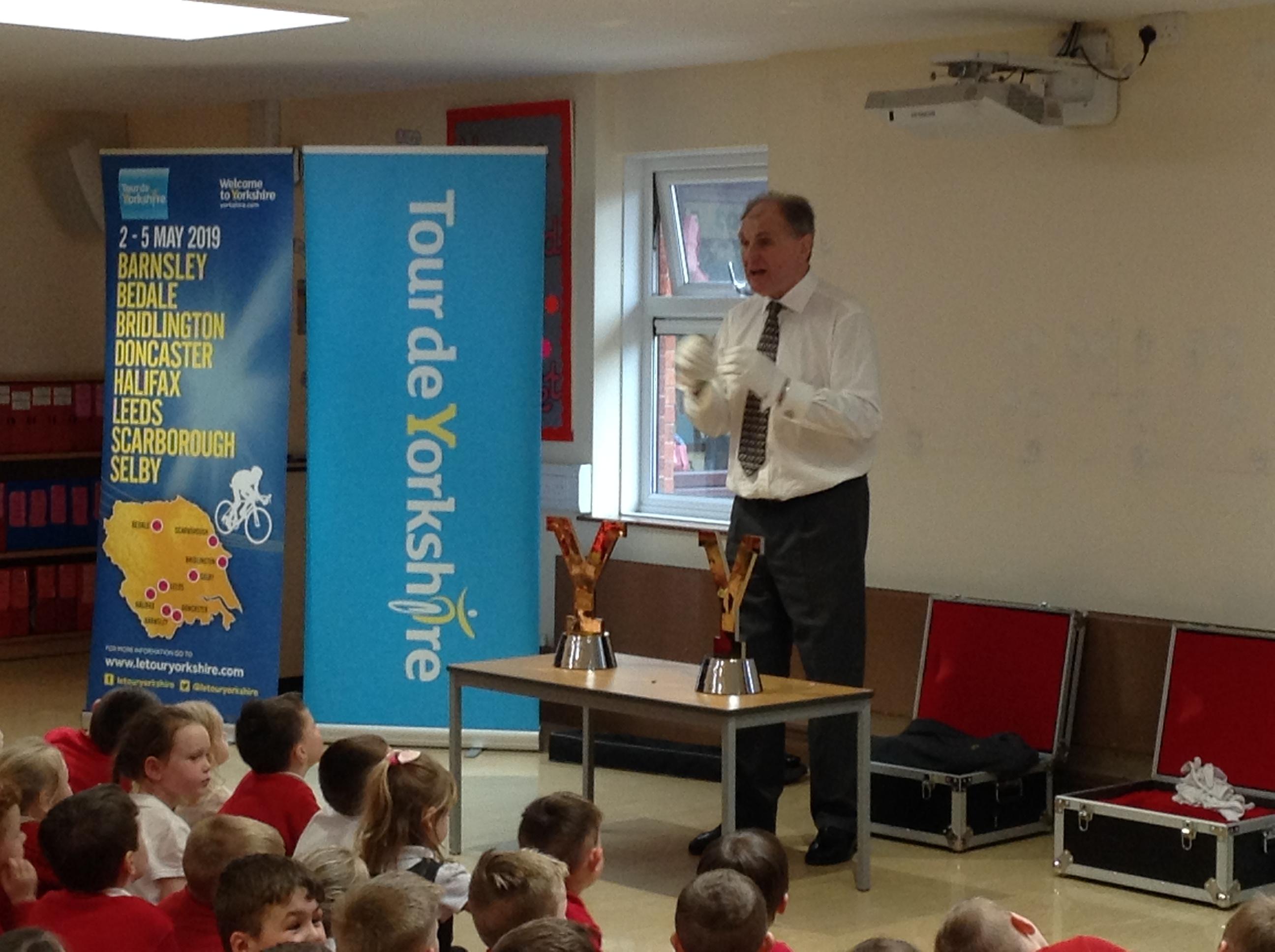 This week we were visited by the good people from the office of Tour de Yorkshire. We are super excited that the race will be running right past our school gate!!!! So…. a nice gentleman came in to tell us all about the different races and what it would mean for our school. We even got to look at the trophies that the winner get their names engraved onto (Miss Wroe and Mrs Tabbner even got to hold them and they were very heavy. They had to wear special gloves to protect the trophy).
