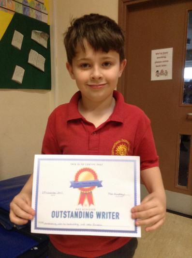 This week Dylan was chosen as outstanding writer due to his much improved handwriting and letter formation.  Dylan has worked really hard ensuring that his descenders fall below the line and that his letters are the same size.  Well done Dylan.