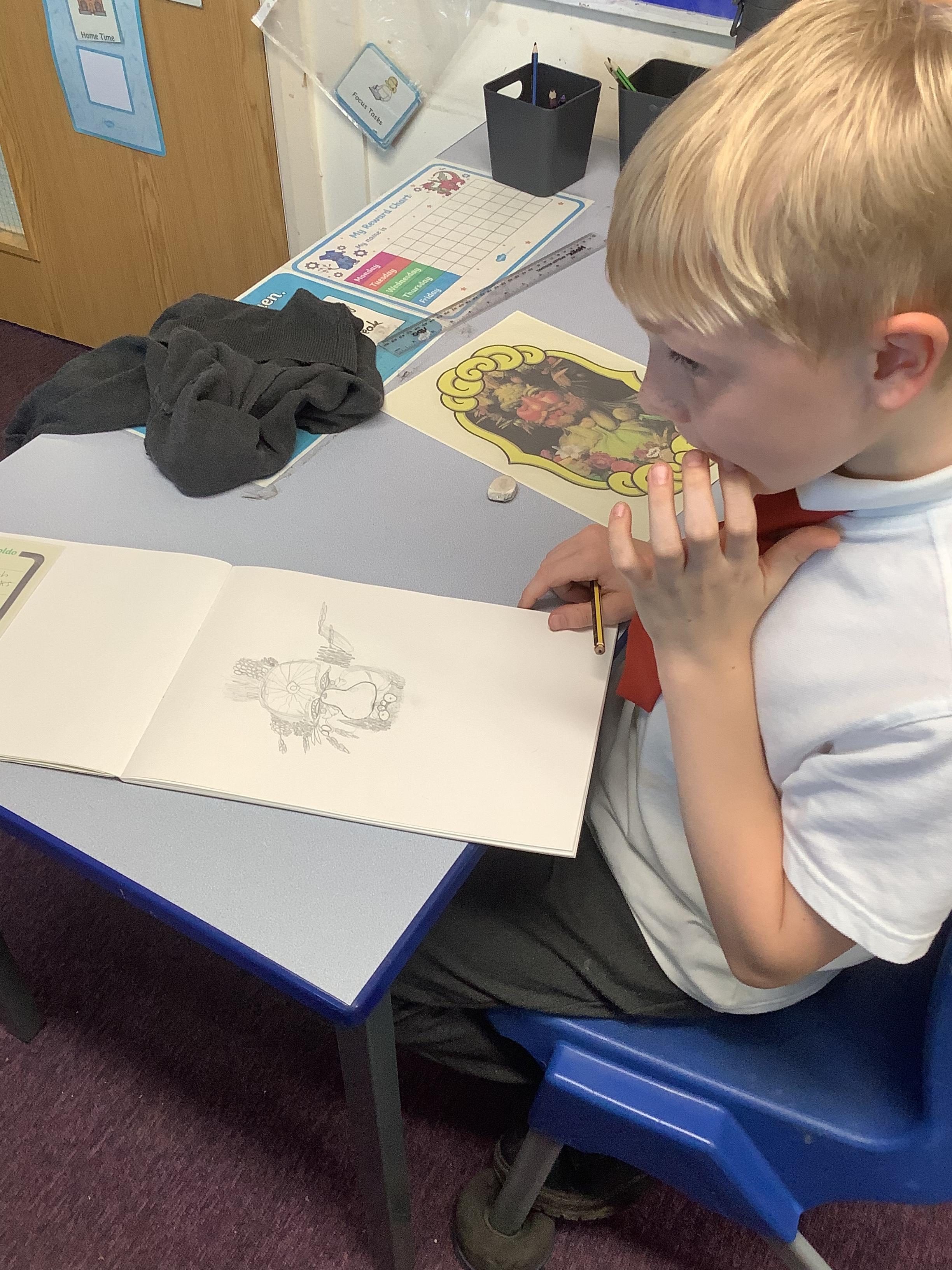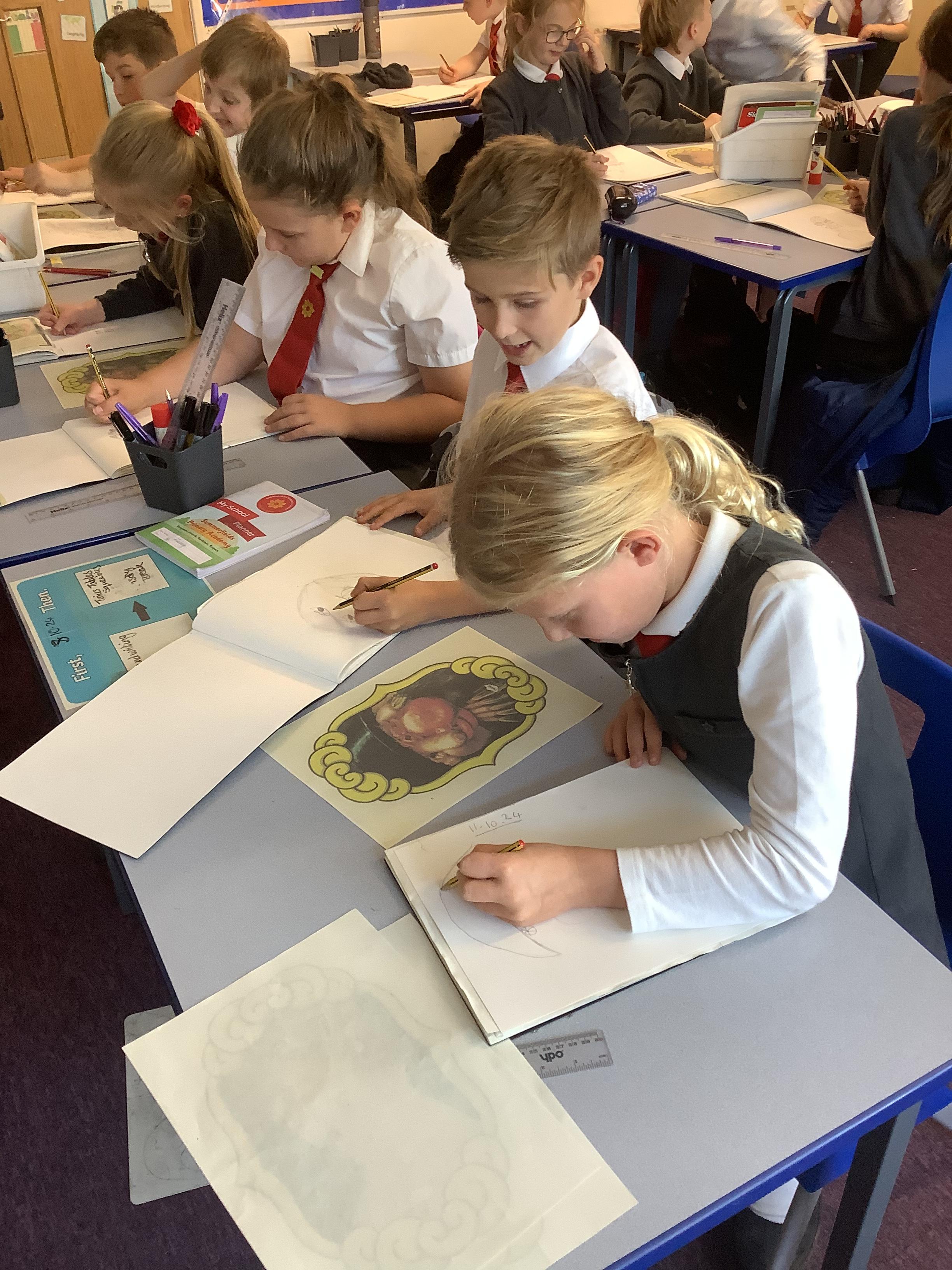 We have been studying the Italian artist Giuseppe Acrimboldo and his unusual style of creating portraits by recreating features using fruit and vegetables. Here we are having a go at recreating some of his famous works using oil pastels.