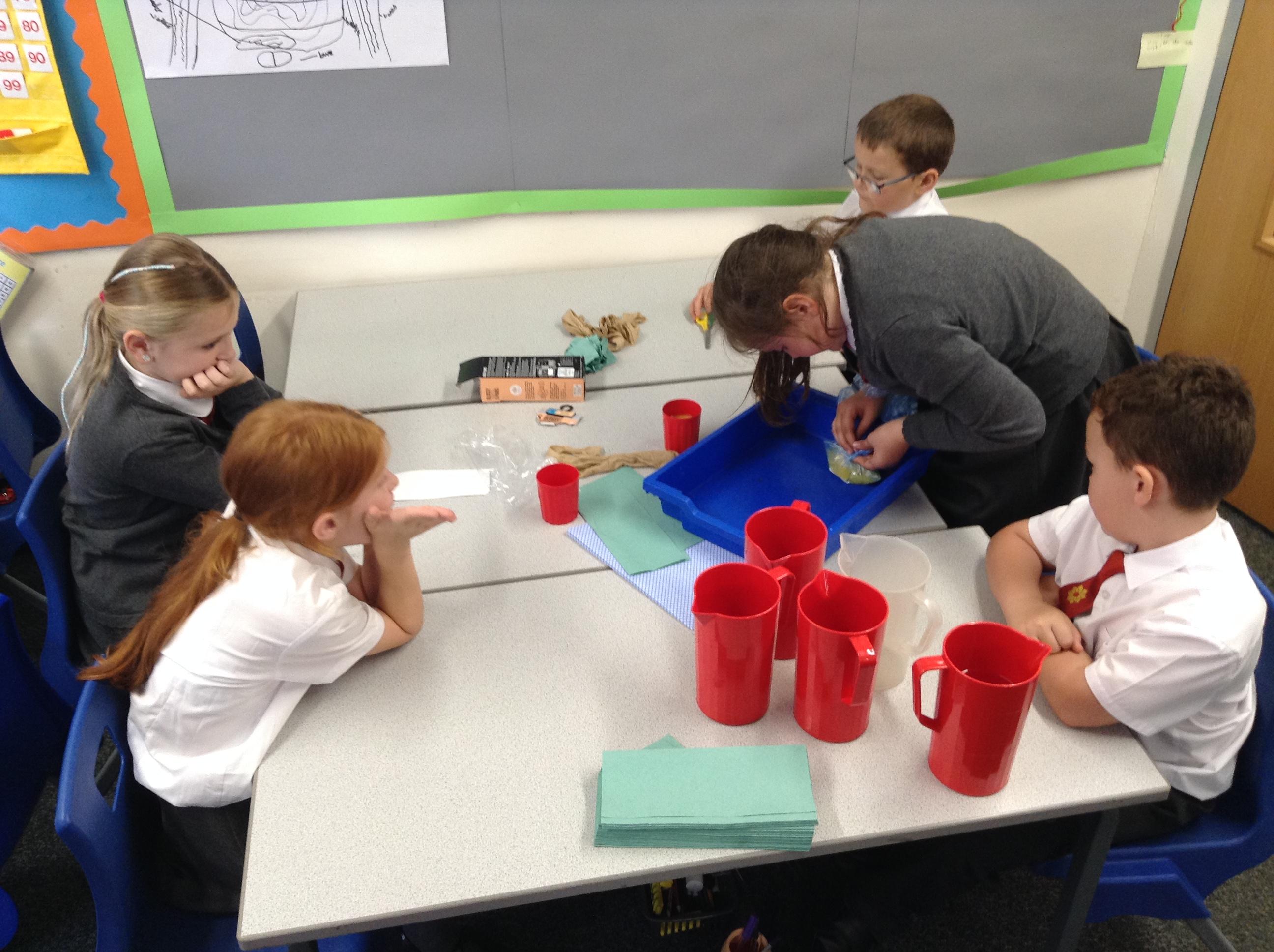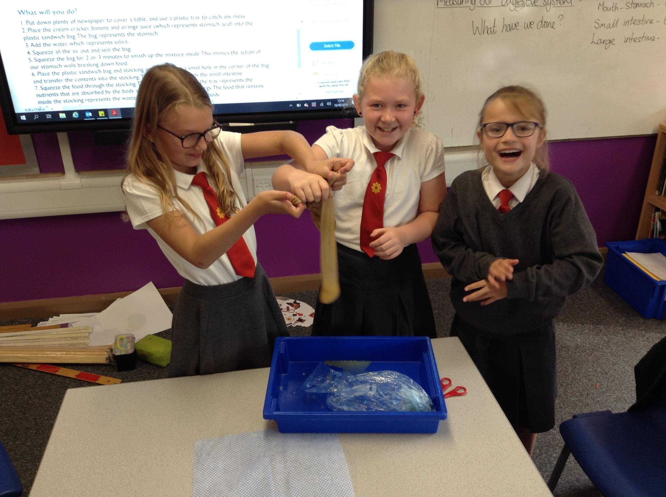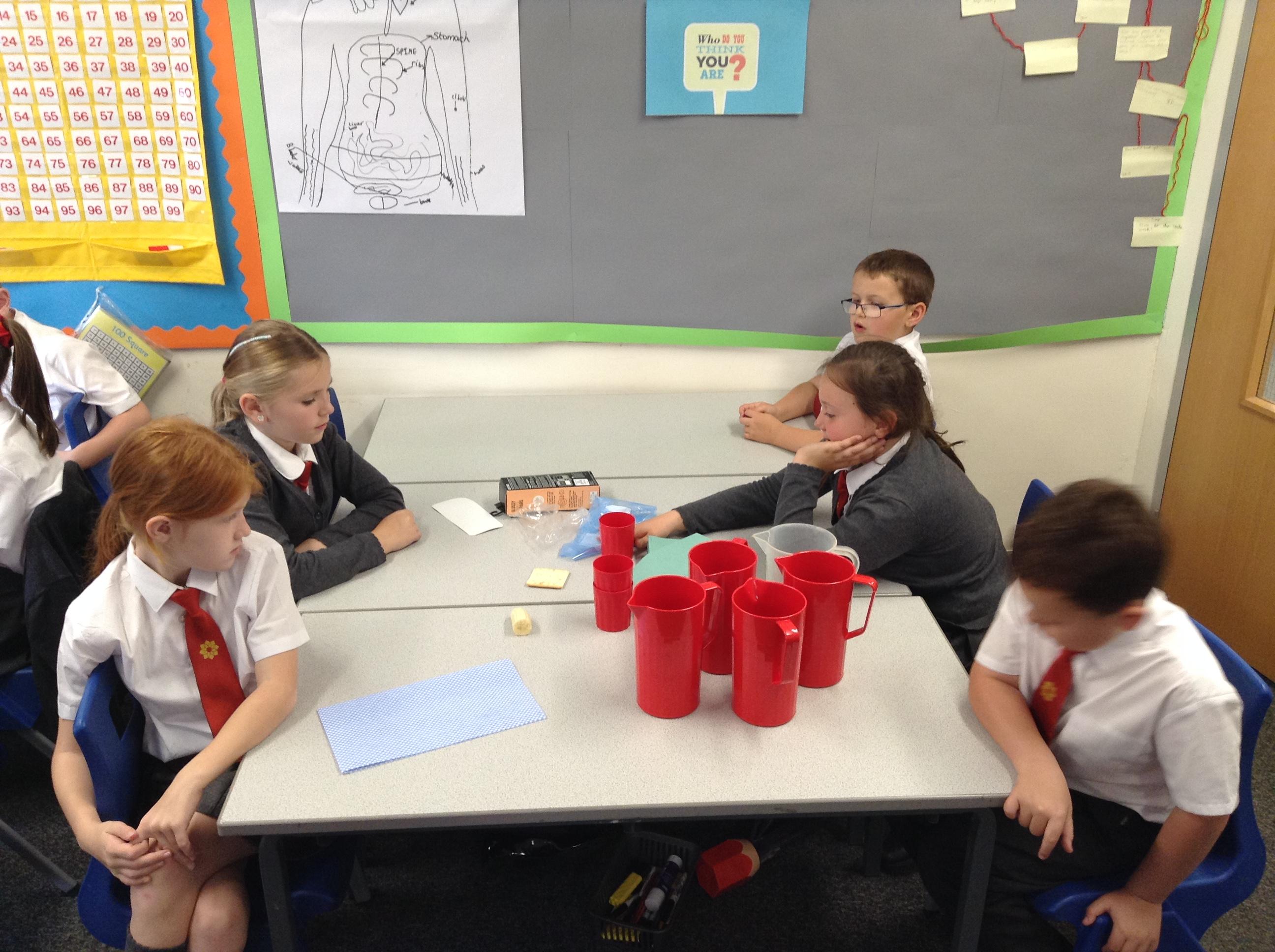 Using a cream cracker, banana, orange juice and water we created a digestive system. We had lots of fun digesting the food and removing the waste from our stomach.