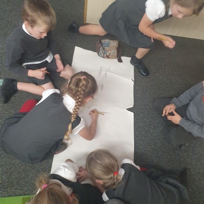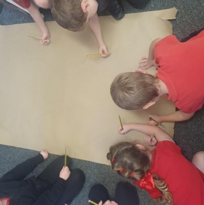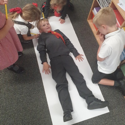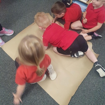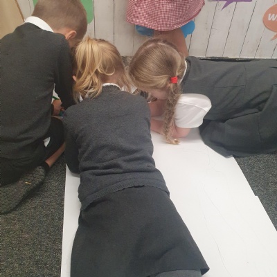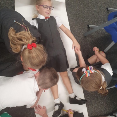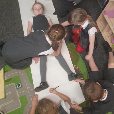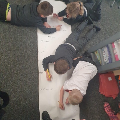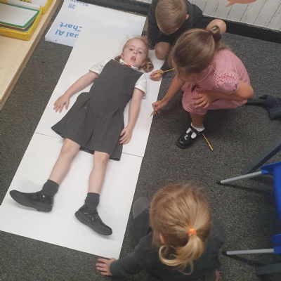 We drew around each other to give us the outline of the human body and then labelled as many parts as we could and dicussed their purpose and use ��