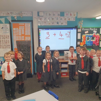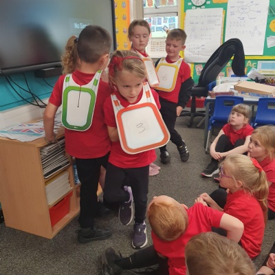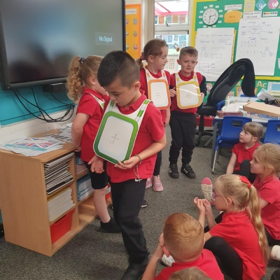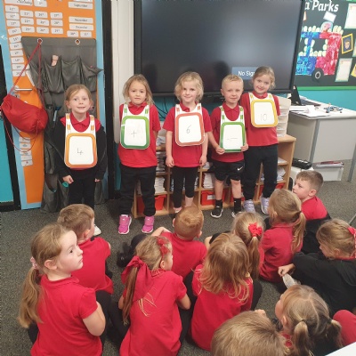 Using number sentence vests to help Miss Dooling master her number sentence skills ��